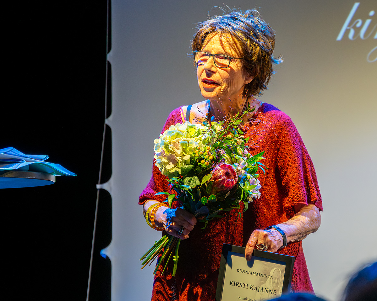 Kunniamaininta myönnetään Kirsti Kajanteen runokokoelmalle Hullulla on paksut sormet (Momentum Kirjat, 2023) seuraavin perusteluin: ”Teos ravistelee ja saa lukijan ymmärtämään mielen järkkymisen ainutlaatuista kokemusmaailmaa.”